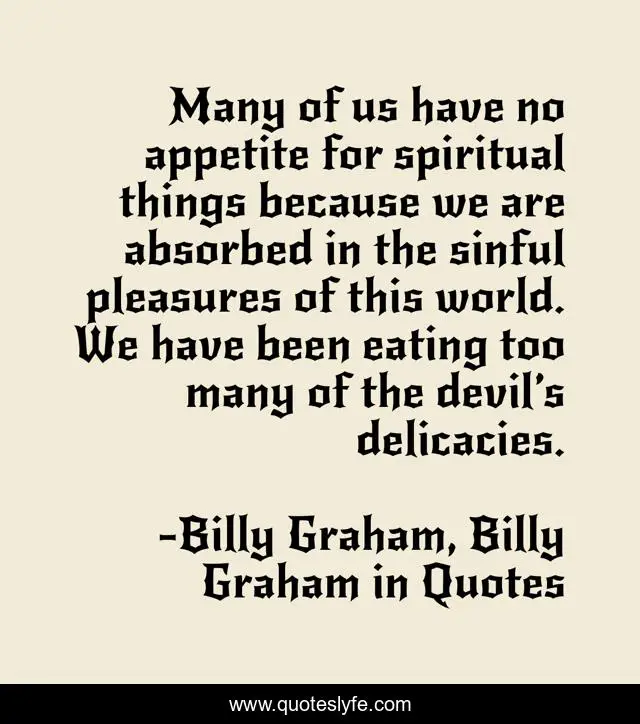 This page presents the quote "Many of us have no appetite for spiritual things because we are absorbed in the sinful pleasures of this world. We have been eating too many of the devil’s delicacies.". Author of this quote is Billy Graham, Billy Graham in Quotes. This quote is about pleasure, billy-graham,.