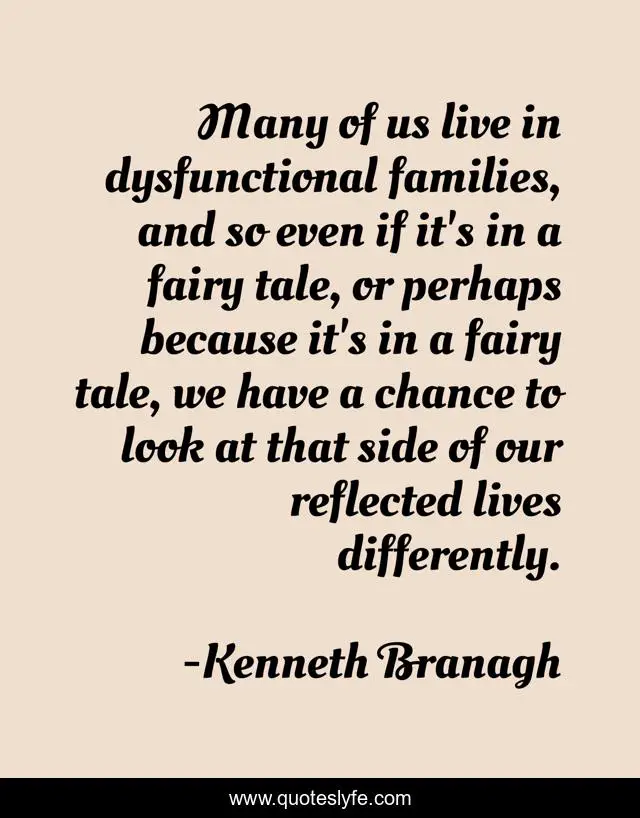 This page presents the quote "Many of us live in dysfunctional families, and so even if it's in a fairy tale, or perhaps because it's in a fairy tale, we have a chance to look at that side of our reflected lives differently.". Author of this quote is Kenneth Branagh. This quote is about live, look, fairy,.