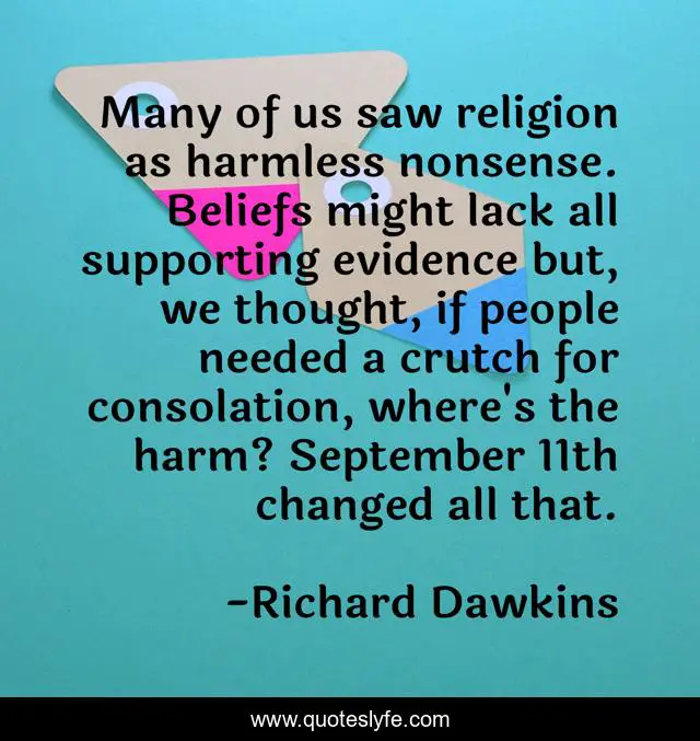 This page presents the quote "Many of us saw religion as harmless nonsense. Beliefs might lack all supporting evidence but, we thought, if people needed a crutch for consolation, where's the harm? September 11th changed all that.". Author of this quote is Richard Dawkins. This quote is about thinking, religion, critical, science,.