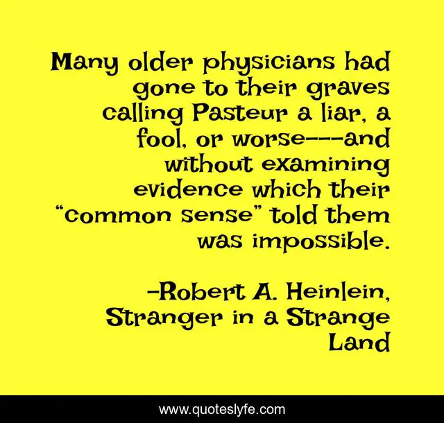 This page presents the quote "Many older physicians had gone to their graves calling Pasteur a liar, a fool, or worse---and without examining evidence which their “common sense” told them was impossible.". Author of this quote is Robert A. Heinlein, Stranger in a Strange Land. .