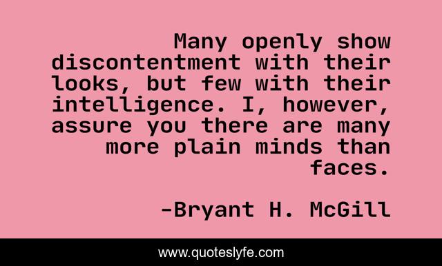This page presents the quote "Many openly show discontentment with their looks, but few with their intelligence. I, however, assure you there are many more plain minds than faces.". Author of this quote is Bryant H. McGill. This quote is about looks, minds,.