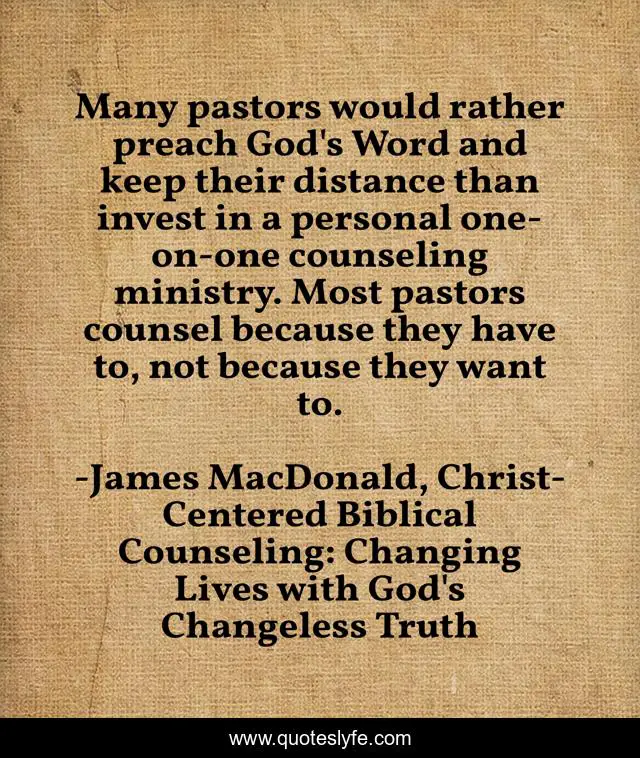 This page presents the quote "Many pastors would rather preach God's Word and keep their distance than invest in a personal one-on-one counseling ministry. Most pastors counsel because they have to, not because they want to.". Author of this quote is James MacDonald, Christ-Centered Biblical Counseling: Changing Lives with God's Changeless Truth. .