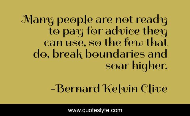 This page presents the quote "Many people are not ready to pay for advice they can use, so the few that do, break boundaries and soar higher.". Author of this quote is Bernard Kelvin Clive. This quote is about teaching, advice, coaching, consulting, value,.