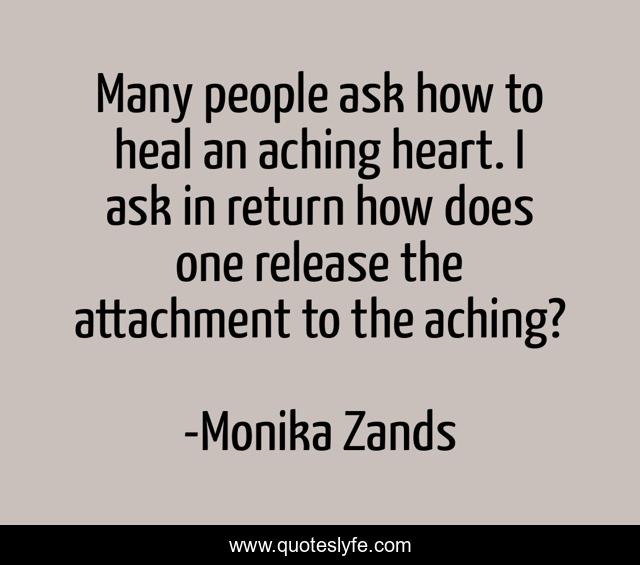 This page presents the quote "Many people ask how to heal an aching heart. I ask in return how does one release the attachment to the aching?". Author of this quote is Monika Zands. This quote is about personal-development, spirituality, love, healing, affection,.