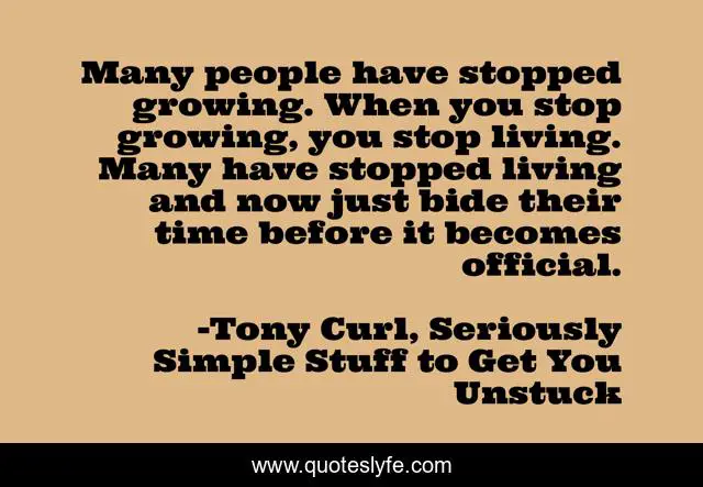 This page presents the quote "Many people have stopped growing. When you stop growing, you stop living. Many have stopped living and now just bide their time before it becomes official.". Author of this quote is Tony Curl, Seriously Simple Stuff to Get You Unstuck. This quote is about action, growth, goals, dreams, plan,.