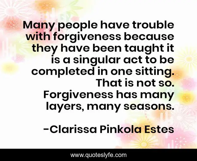 This page presents the quote "Many people have trouble with forgiveness because they have been taught it is a singular act to be completed in one sitting. That is not so. Forgiveness has many layers, many seasons.". Author of this quote is Clarissa Pinkola Estes. This quote is about seasons, trouble, people,.