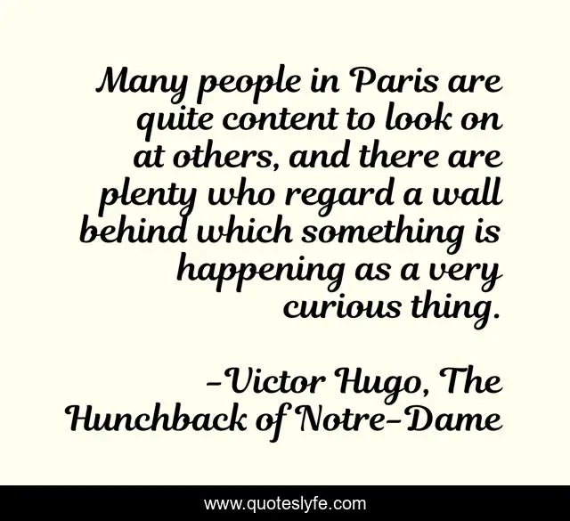 This page presents the quote "Many people in Paris are quite content to look on at others, and there are plenty who regard a wall behind which something is happening as a very curious thing.". Author of this quote is Victor Hugo, The Hunchback of Notre-Dame. .