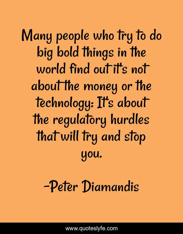 This page presents the quote "Many people who try to do big bold things in the world find out it's not about the money or the technology: It's about the regulatory hurdles that will try and stop you.". Author of this quote is Peter Diamandis. This quote is about money, world, people,.