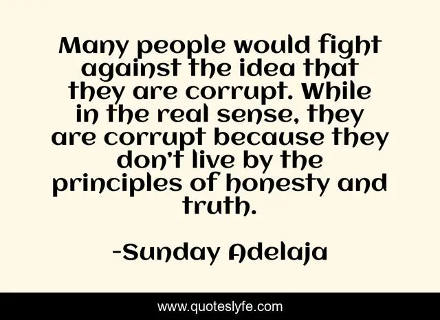 This page presents the quote "Many people would fight against the idea that they are corrupt. While in the real sense, they are corrupt because they don’t live by the principles of honesty and truth.". Author of this quote is Sunday Adelaja. This quote is about corrupt, honesty, truth, principles,.