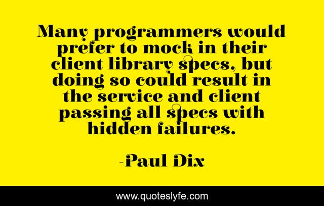 This page presents the quote "Many programmers would prefer to mock in their client library specs, but doing so could result in the service and client passing all specs with hidden failures.". Author of this quote is Paul Dix. .