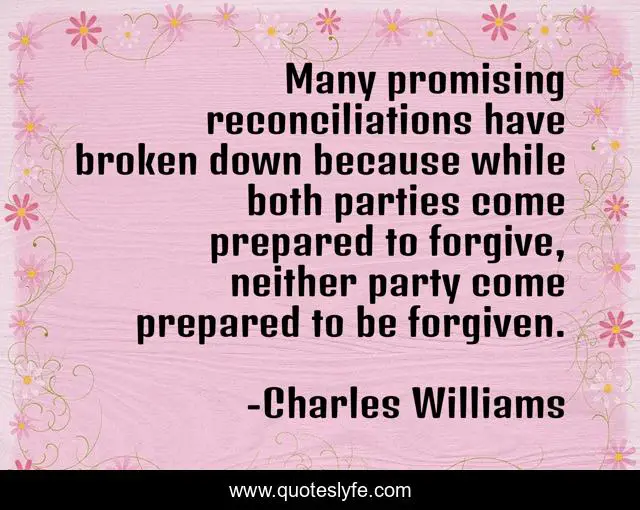 This page presents the quote "Many promising reconciliations have broken down because while both parties come prepared to forgive, neither party come prepared to be forgiven.". Author of this quote is Charles Williams. This quote is about broken, forgive, party,.