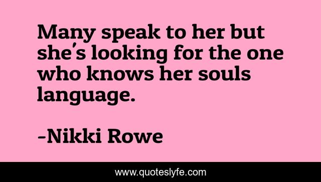 This page presents the quote "Many speak to her but she's looking for the one who knows her souls language.". Author of this quote is Nikki Rowe. This quote is about independent, soul-journey, woman, love, twin-flame-love, gypsy-girl, freedom, soul, wild-and-free,.