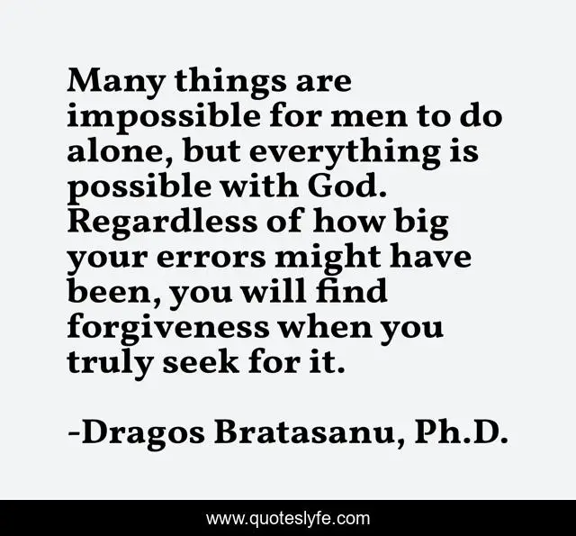 This page presents the quote "Many things are impossible for men to do alone, but everything is possible with God. Regardless of how big your errors might have been, you will find forgiveness when you truly seek for it.". Author of this quote is Dragos Bratasanu, Ph.D.. This quote is about faith, love, god, spirituality, solutions, trust, forgiveness, affection, problems-in-life,.