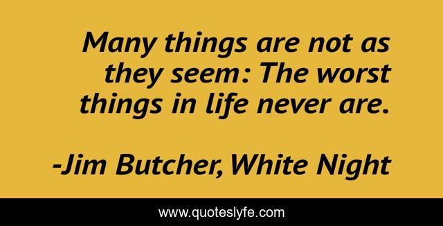 This page presents the quote "Many things are not as they seem: The worst things in life never are.". Author of this quote is Jim Butcher, White Night. This quote is about life, deception, harry-dresden,.