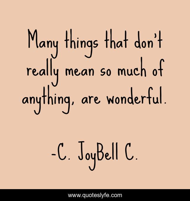 This page presents the quote "Many things that don't really mean so much of anything, are wonderful.". Author of this quote is C. JoyBell C.. This quote is about enthusiasm, meaninglessness, inspirational, wonderment,.