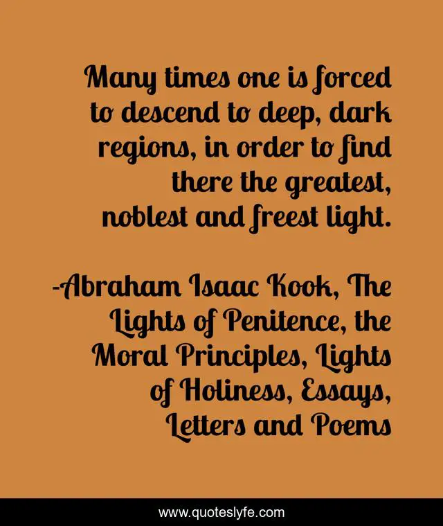 This page presents the quote "Many times one is forced to descend to deep, dark regions, in order to find there the greatest, noblest and freest light.". Author of this quote is Abraham Isaac Kook, The Lights of Penitence, the Moral Principles, Lights of Holiness, Essays, Letters and Poems. This quote is about compassion, love, affection,.