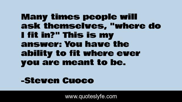 This page presents the quote "Many times people will ask themselves, "where do I fit in?" This is my answer: You have the ability to fit where ever you are meant to be.". Author of this quote is Steven Cuoco. This quote is about quotes-to-live-by, brainy-words, quotes-about-life,.