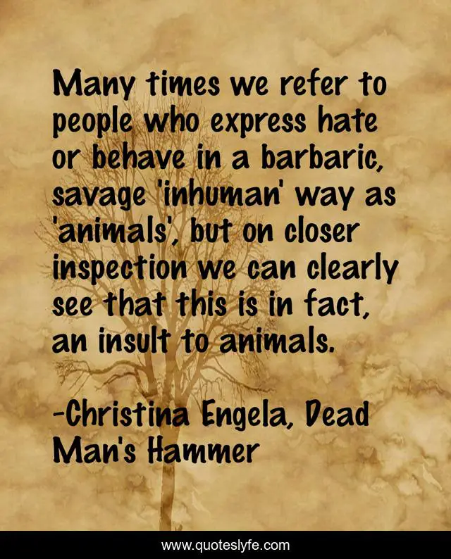 This page presents the quote "Many times we refer to people who express hate or behave in a barbaric, savage 'inhuman' way as 'animals', but on closer inspection we can clearly see that this is in fact, an insult to animals.". Author of this quote is Christina Engela, Dead Man's Hammer. This quote is about savage, animals, inhuman, insult, barbaric, closer-inspection, express-hate, fact, refer,.