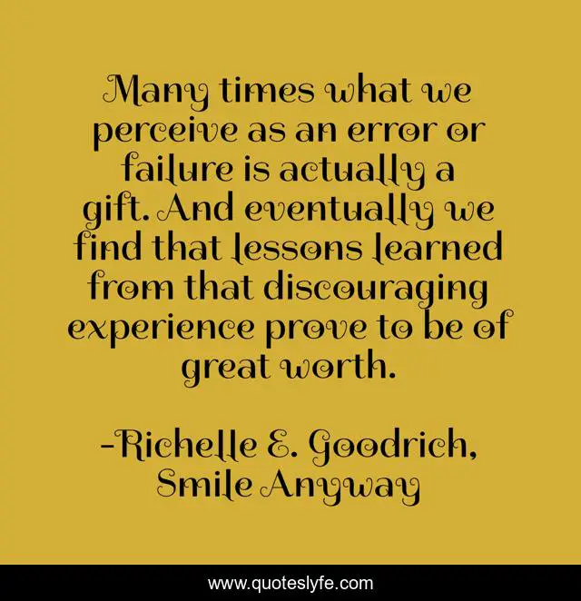 This page presents the quote "Many times what we perceive as an error or failure is actually a gift. And eventually we find that lessons learned from that discouraging experience prove to be of great worth.". Author of this quote is Richelle E. Goodrich, Smile Anyway. This quote is about failure, mistakes, errors, experience, learning-from-mistakes,.