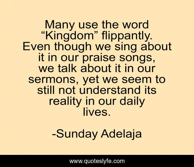 This page presents the quote "Many use the word “Kingdom” flippantly. Even though we sing about it in our praise songs, we talk about it in our sermons, yet we seem to still not understand its reality in our daily lives.". Author of this quote is Sunday Adelaja. This quote is about kingdom, flippant, reality, praise, sermons, songs,.