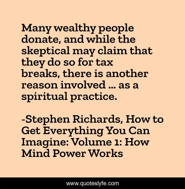 This page presents the quote "Many wealthy people donate, and while the skeptical may claim that they do so for tax breaks, there is another reason involved … as a spiritual practice.". Author of this quote is Stephen Richards, How to Get Everything You Can Imagine: Volume 1: How Mind Power Works. This quote is about mind-power, manifesting-wealth, wishes-fulfilled,.