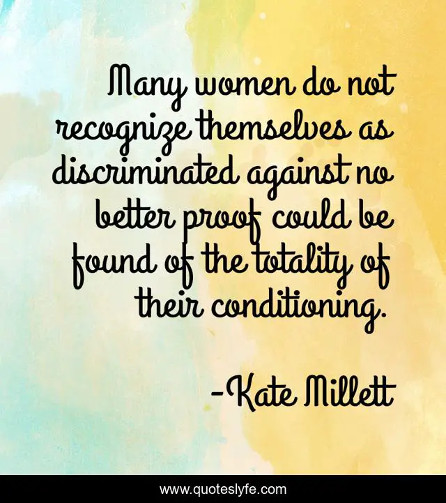 This page presents the quote "Many women do not recognize themselves as discriminated against no better proof could be found of the totality of their conditioning.". Author of this quote is Kate Millett. This quote is about better, recognize, proof,.