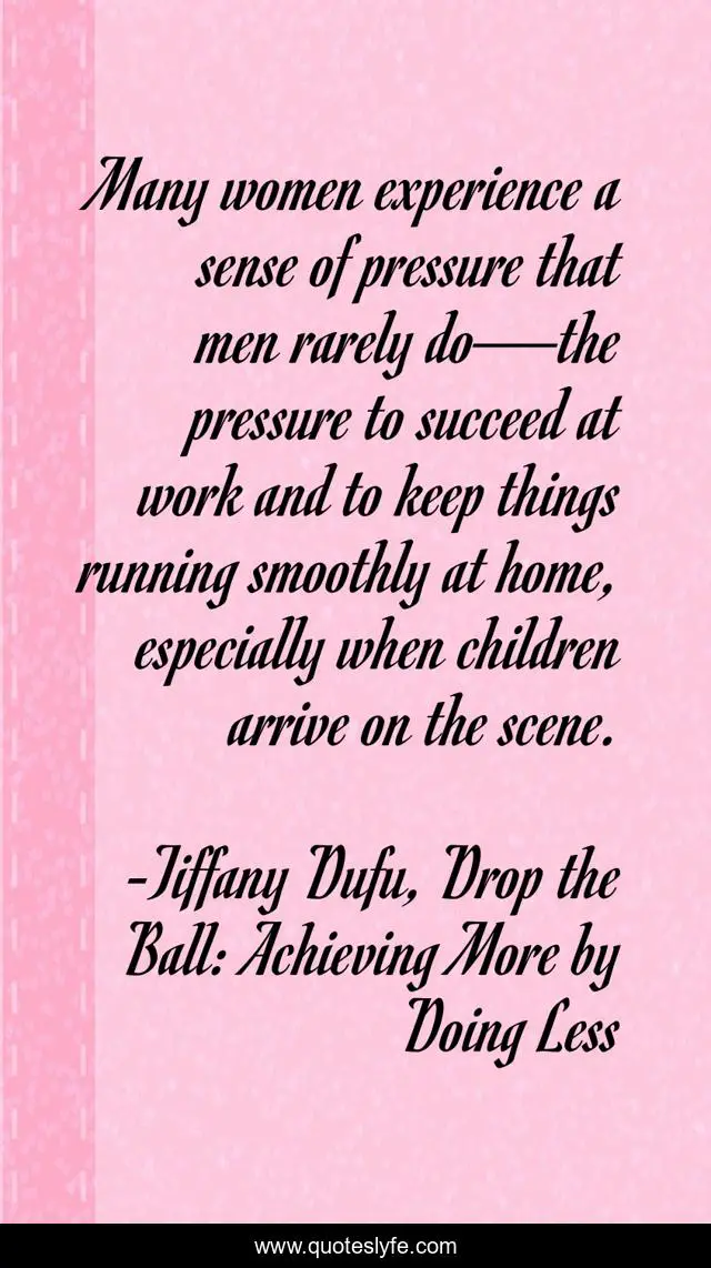 This page presents the quote "Many women experience a sense of pressure that men rarely do—the pressure to succeed at work and to keep things running smoothly at home, especially when children arrive on the scene.". Author of this quote is Tiffany Dufu, Drop the Ball: Achieving More by Doing Less. This quote is about motherhood, feminism, self-help,.