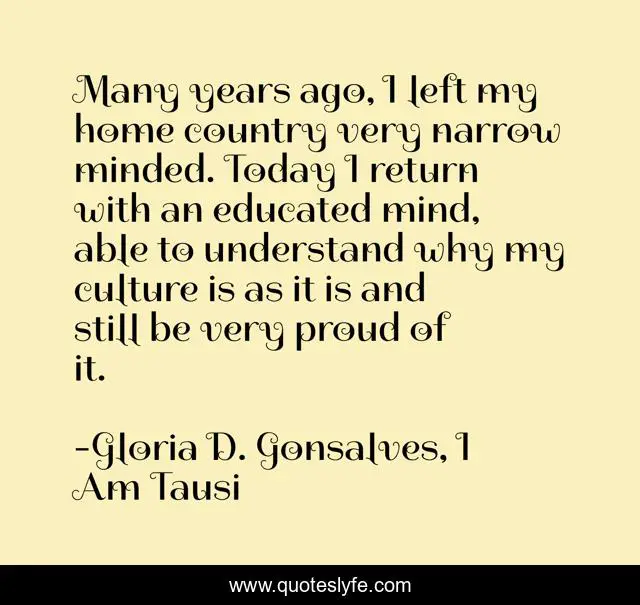 This page presents the quote "Many years ago, I left my home country very narrow minded. Today I return with an educated mind, able to understand why my culture is as it is and still be very proud of it.". Author of this quote is Gloria D. Gonsalves, I Am Tausi. .