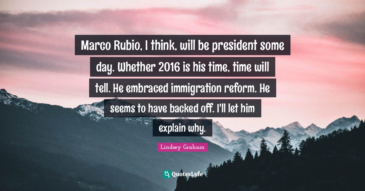 This page presents the quote "Marco Rubio, I think, will be president some day. Whether 2016 is his time, time will tell. He embraced immigration reform. He seems to have backed off. I'll let him explain why.". Author of this quote is Lindsey Graham. This quote is about time, time will tell, seems, immigration, immigration reform, thinking, president,.
