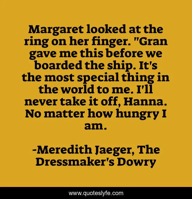 This page presents the quote "Margaret looked at the ring on her finger. "Gran gave me this before we boarded the ship. It's the most special thing in the world to me. I'll never take it off, Hanna. No matter how hungry I am.". Author of this quote is Meredith Jaeger, The Dressmaker's Dowry. This quote is about irish, historical-fiction, immigrant-experience,.