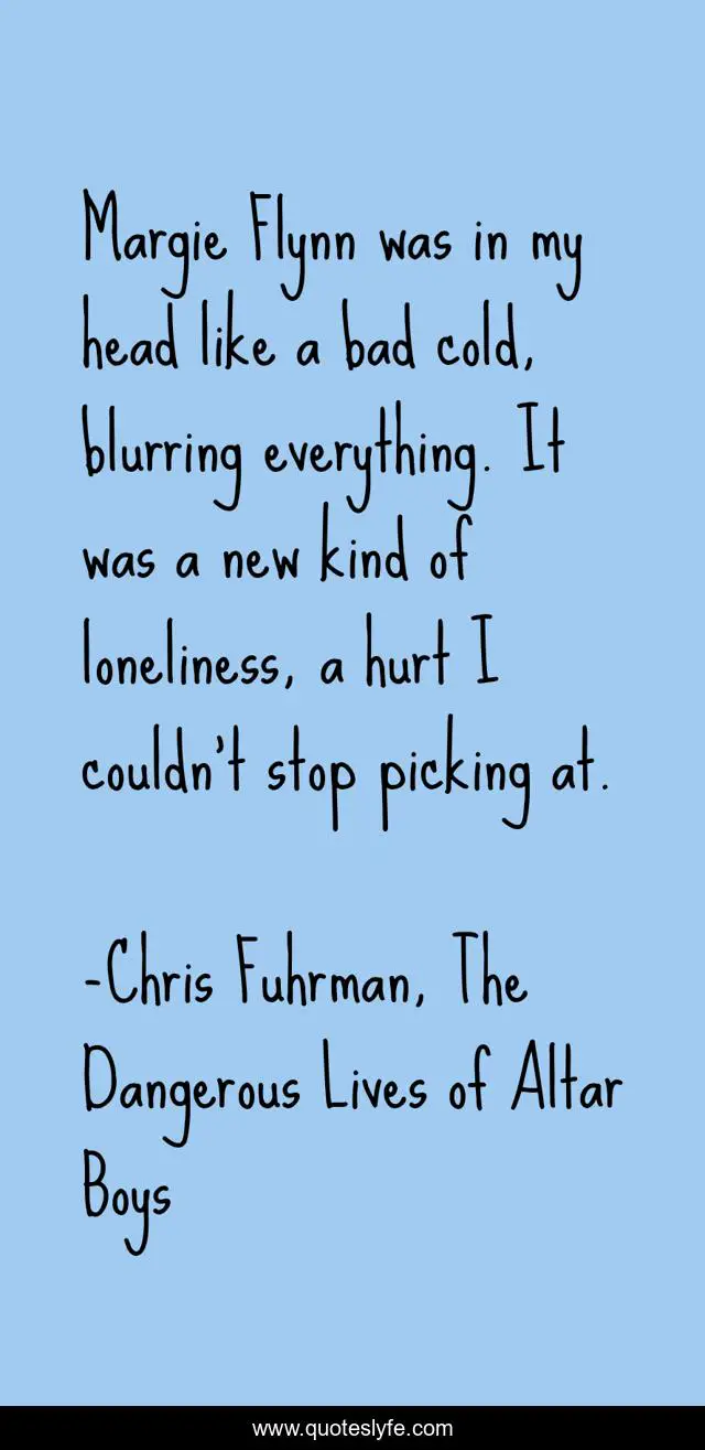 This page presents the quote "Margie Flynn was in my head like a bad cold, blurring everything. It was a new kind of loneliness, a hurt I couldn’t stop picking at.". Author of this quote is Chris Fuhrman, The Dangerous Lives of Altar Boys. This quote is about loneliness, love, affection, love-hurts,.
