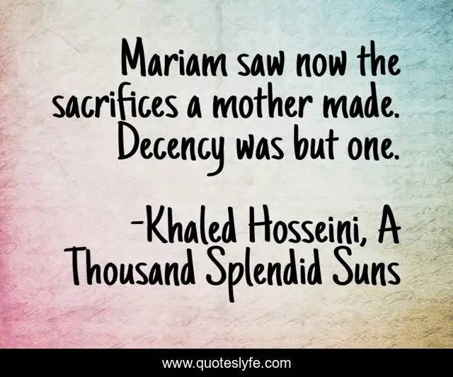 This page presents the quote "Mariam saw now the sacrifices a mother made. Decency was but one.". Author of this quote is Khaled Hosseini, A Thousand Splendid Suns. This quote is about sacrifice, mother,.