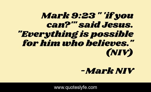 This page presents the quote "Mark 9:23 " 'if you can?'" said Jesus. "Everything is possible for him who believes." (NIV)". Author of this quote is Mark NIV. This quote is about faith, bible, believers, believe-and-achieve, believer, mark, believe-in-yourself, believe-in-god,.