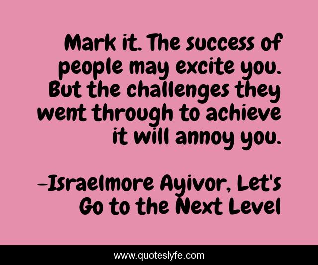 This page presents the quote "Mark it. The success of people may excite you. But the challenges they went through to achieve it will annoy you.". Author of this quote is Israelmore Ayivor, Let's Go to the Next Level. This quote is about achievements, annoy, challenges, mark-it,.