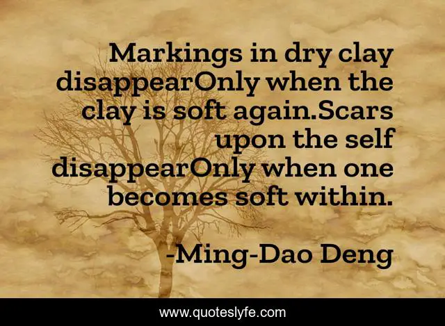 This page presents the quote "Markings in dry clay disappearOnly when the clay is soft again.Scars upon the self disappearOnly when one becomes soft within.". Author of this quote is Ming-Dao Deng. This quote is about life, scars, poetic, self,.