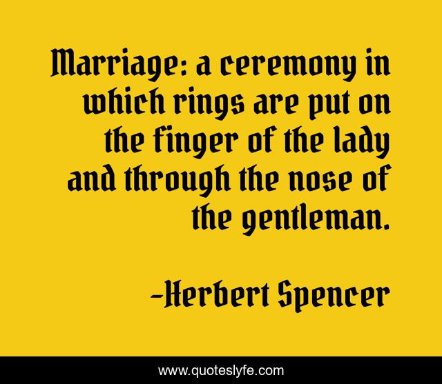 This page presents the quote "Marriage: a ceremony in which rings are put on the finger of the lady and through the nose of the gentleman.". Author of this quote is Herbert Spencer. This quote is about gentleman, through, finger,.