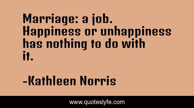 This page presents the quote "Marriage: a job. Happiness or unhappiness has nothing to do with it.". Author of this quote is Kathleen Norris. .