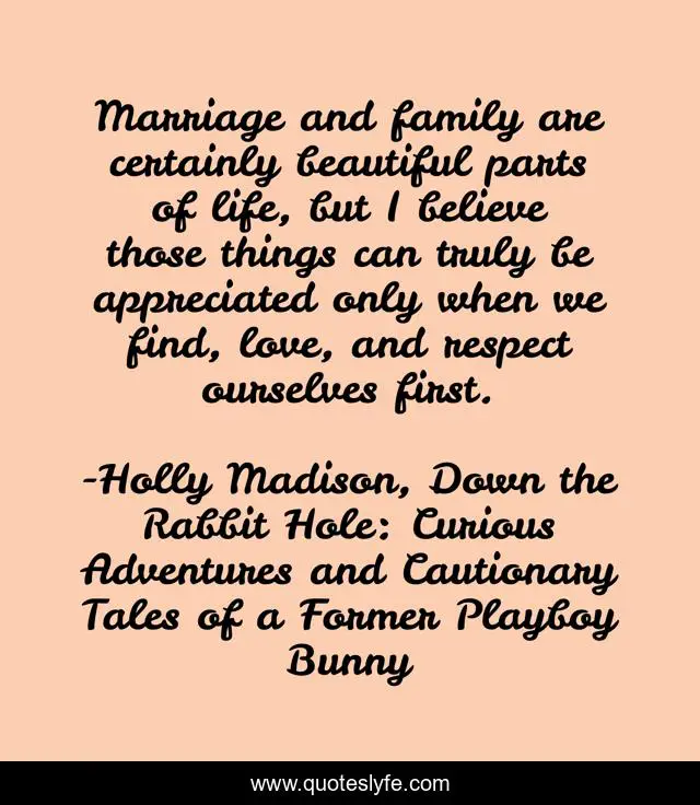 This page presents the quote "Marriage and family are certainly beautiful parts of life, but I believe those things can truly be appreciated only when we find, love, and respect ourselves first.". Author of this quote is Holly Madison, Down the Rabbit Hole: Curious Adventures and Cautionary Tales of a Former Playboy Bunny. This quote is about self-image, marriage, affection, love, respect,.
