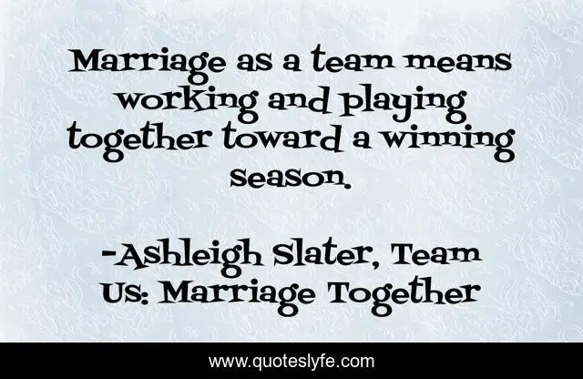 This page presents the quote "Marriage as a team means working and playing together toward a winning season.". Author of this quote is Ashleigh Slater, Team Us: Marriage Together. This quote is about play, love, working, win, winning, marriage, husband, team, playing,.