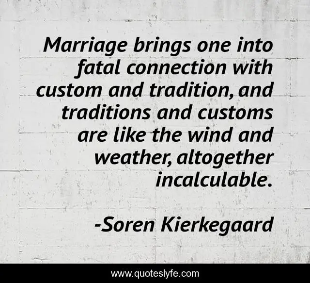 This page presents the quote "Marriage brings one into fatal connection with custom and tradition, and traditions and customs are like the wind and weather, altogether incalculable.". Author of this quote is Soren Kierkegaard. This quote is about weather, tradition, wind,.