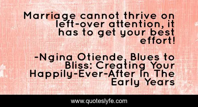This page presents the quote "Marriage cannot thrive on left-over attention, it has to get your best effort!". Author of this quote is Ngina Otiende, Blues to Bliss: Creating Your Happily-Ever-After In The Early Years. This quote is about christian, inpiration, marriage,.