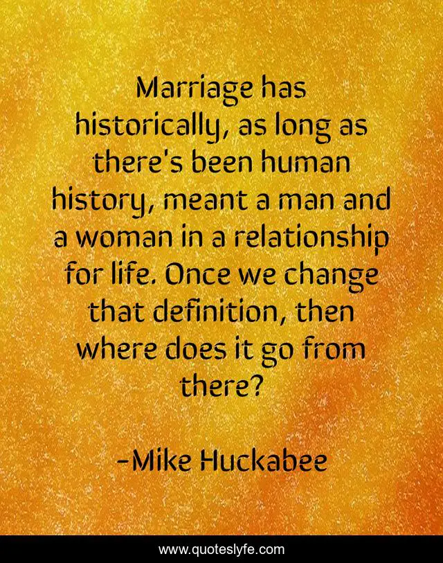 This page presents the quote "Marriage has historically, as long as there's been human history, meant a man and a woman in a relationship for life. Once we change that definition, then where does it go from there?". Author of this quote is Mike Huckabee. This quote is about life, change, relationship,.