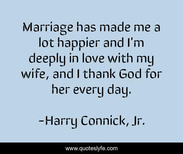 This page presents the quote "Marriage has made me a lot happier and I'm deeply in love with my wife, and I thank God for her every day.". Author of this quote is Harry Connick, Jr.. This quote is about love, marriage, day, affection,.