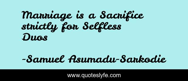 This page presents the quote "Marriage is a Sacrifice strictly for Selfless Duos". Author of this quote is Samuel Asumadu-Sarkodie. This quote is about proverbs, words-of-knowledge, discernment, parables, words-of-wisdom, inspiration,.