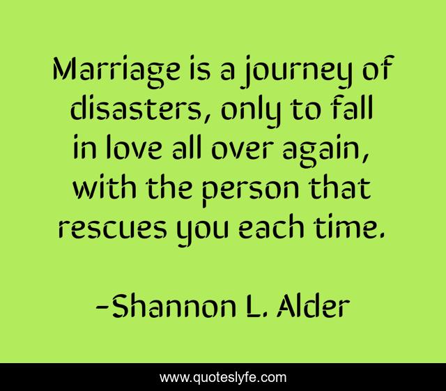 This page presents the quote "Marriage is a journey of disasters, only to fall in love all over again, with the person that rescues you each time.". Author of this quote is Shannon L. Alder. This quote is about forever, love, richer-or-poorer, wife, better-or-worse, sickness-and-health, husband, sticking-it-out, spouse,.