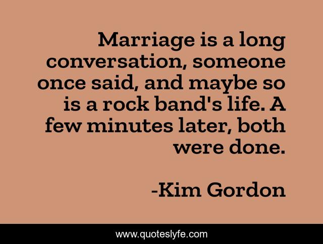 This page presents the quote "Marriage is a long conversation, someone once said, and maybe so is a rock band's life. A few minutes later, both were done.". Author of this quote is Kim Gordon. This quote is about punk-rock-love, marriage,.