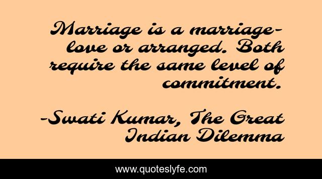 This page presents the quote "Marriage is a marriage- love or arranged. Both require the same level of commitment.". Author of this quote is Swati Kumar, The Great Indian Dilemma. This quote is about arranged-marriage, love-marriage, marriage, commitment,.