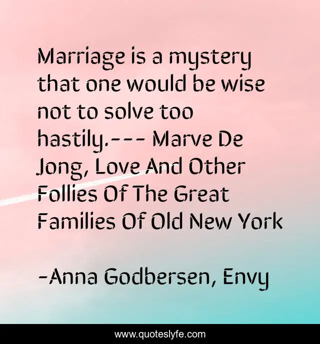 This page presents the quote "Marriage is a mystery that one would be wise not to solve too hastily.--- Marve De Jong, Love And Other Follies Of The Great Families Of Old New York". Author of this quote is Anna Godbersen, Envy. This quote is about marve-de-jong, marriage, new-york,.