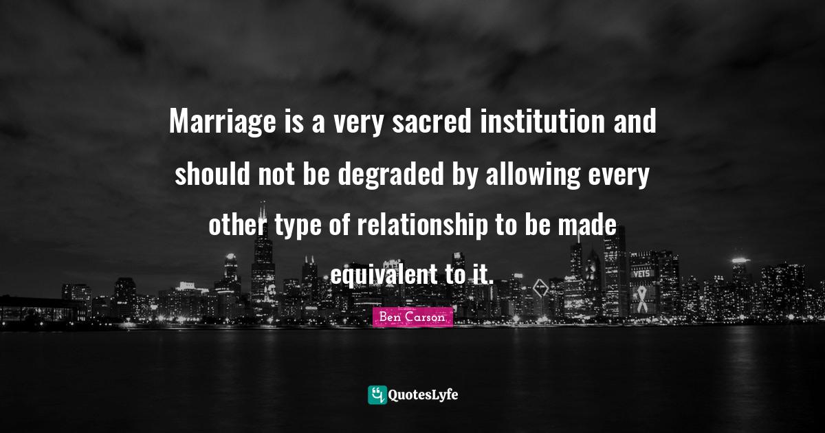 This page presents the quote "Marriage is a very sacred institution and should not be degraded by allowing every other type of relationship to be made equivalent to it.". Author of this quote is Ben Carson. This quote is about relationship, sacred,.