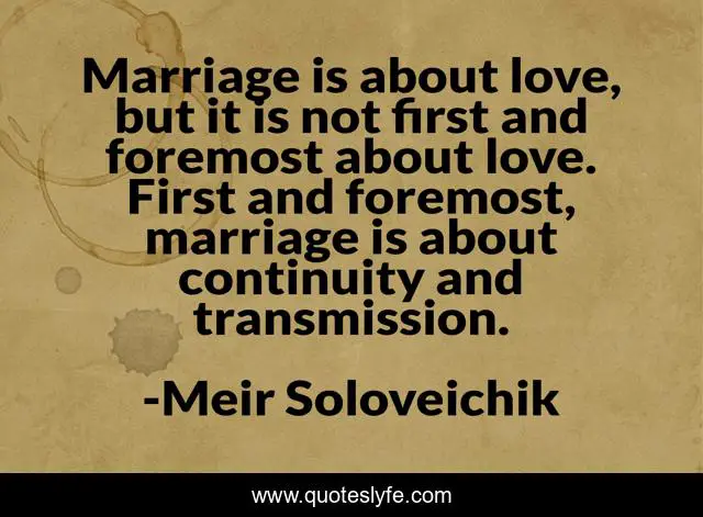 This page presents the quote "Marriage is about love, but it is not first and foremost about love. First and foremost, marriage is about continuity and transmission.". Author of this quote is Meir Soloveichik. This quote is about continuity, love, affection, first,.